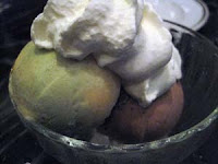 Two scoops of ice cream: Golden plum-pistachio & coffee caramelThough I requested no whipped cream, I still got it. The coffee caramel was a deep, strong flavored ice cream that drew me in with every bite. I liked the originality of the golden-plum pistachio, but the flavors weren't mixed into one. Instead, the golden plum was marbled into the pistachio and it had a noticeably icier composition than the smoother pistachio part, which had a liqueur-like edge to it. But both were a lovely close to the meal.